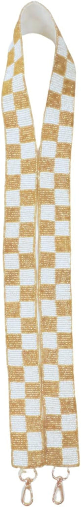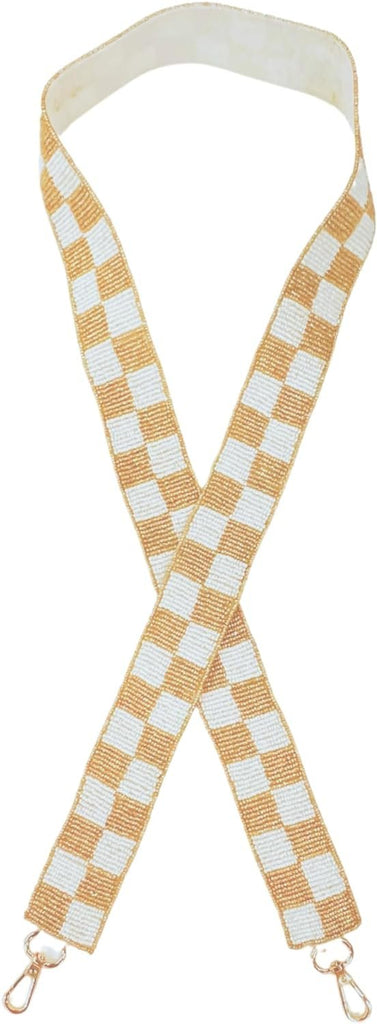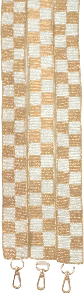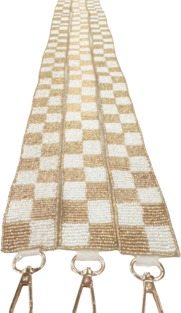 Introducing our stunning Tan and White Checkered Beaded Purse Strap – a chic accessory to elevate your style game. Measuring 49" x 1.75" and featuring robust metal clasps, this strap effortlessly combines fashion and functionality. Whether you're in search of purse straps with clips, need them in bulk, or desire a unique beaded strap with a tan and white checkered pattern, this accessory is a perfect fit. Enhance your bag with a touch of sophistication, as the checkered design adds a timeless and versatile charm. Designed to be a standout replacement purse strap, this accessory is not only stylish but also durable. It seamlessly complements your diverse fashion needs, serving as a distinctive guitar purse strap or a statement piece for gameday or crossbody wear. For women who appreciate a blend of elegance and flair, our Tan and White Checkered Beaded Purse Strap is the perfect choice. With its versatile design, it adds a touch of personality to any occasion, making it an essential part of your accessory collection. Transform your bag into a fashion statement with this beaded strap that captures attention and exudes style. Order now and redefine your look with the sophisticated charm of our Tan and White Checkered Beaded Purse Strap – a true fusion of practicality and fashion.