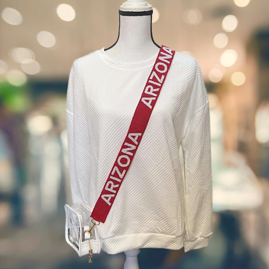 The Arizona Beaded Purse Strap (49 inches with gold hardware) is a stylish and functional accessory that adds a touch of flair to any purse or bag. This beaded purse strap is hand-beaded with precision, featuring a vibrant design in red and white, making it the perfect choice for game day accessories or a unique college football statement. Whether you're supporting your team at a college football game or attending a game day DIY event, this strap is a fashionable way to complement your clear purse or other bags. The gold hardware adds an elegant touch, elevating the look of the strap and making it suitable for a variety of occasions.
