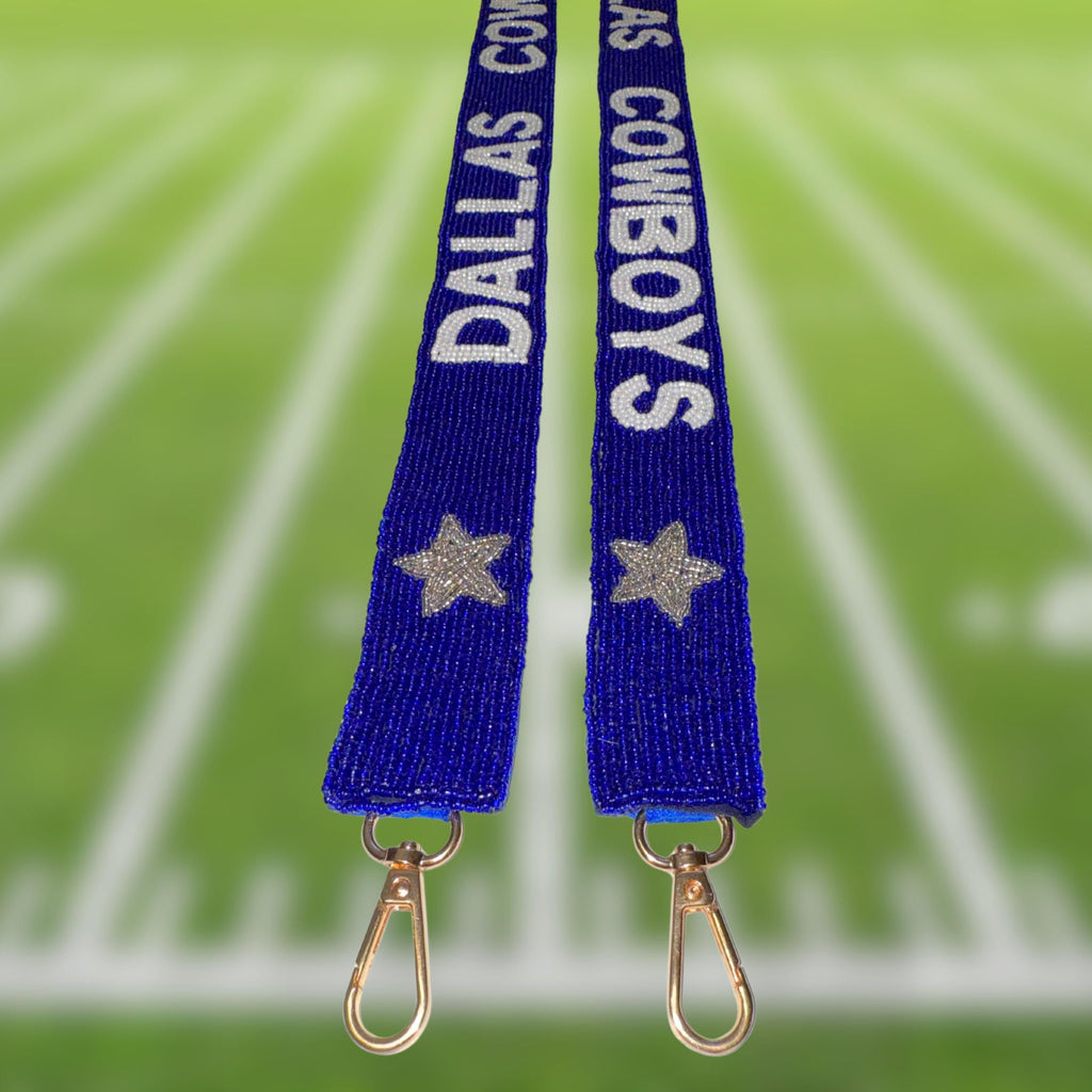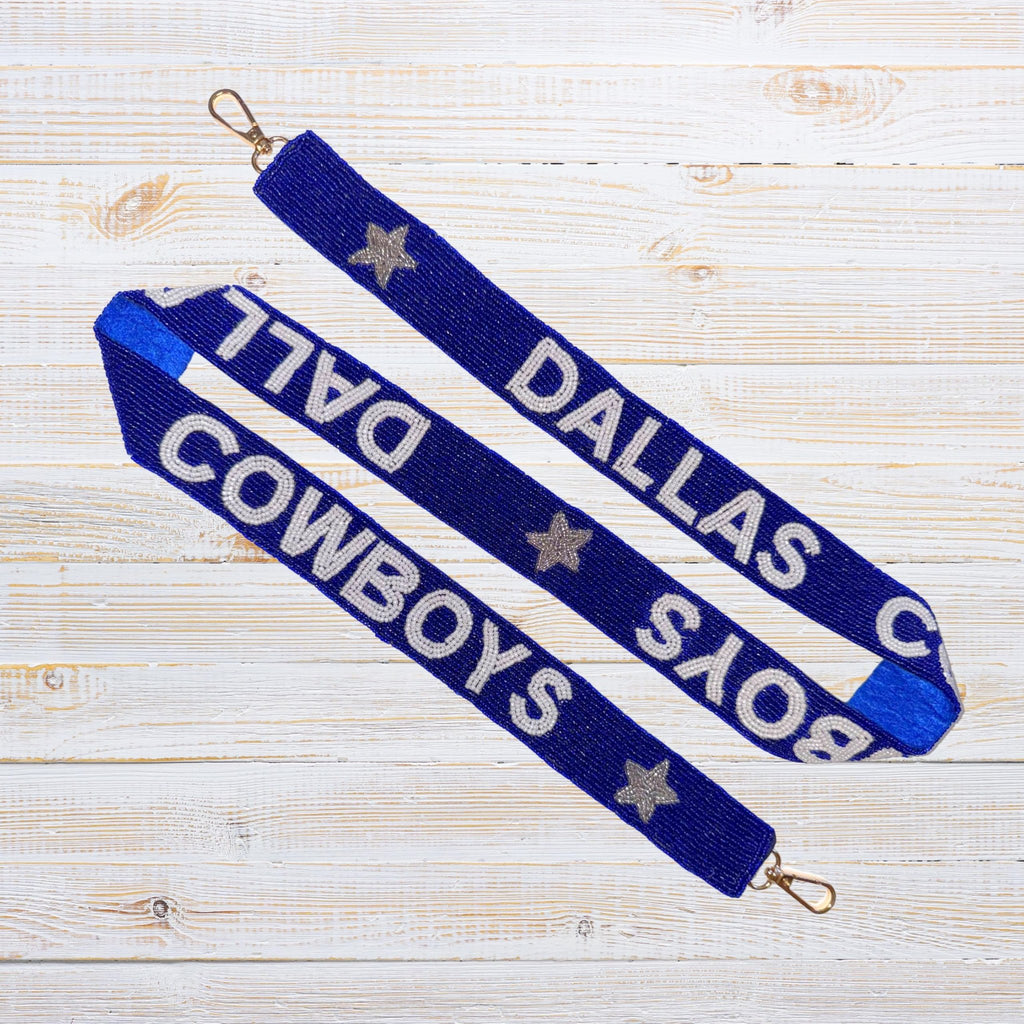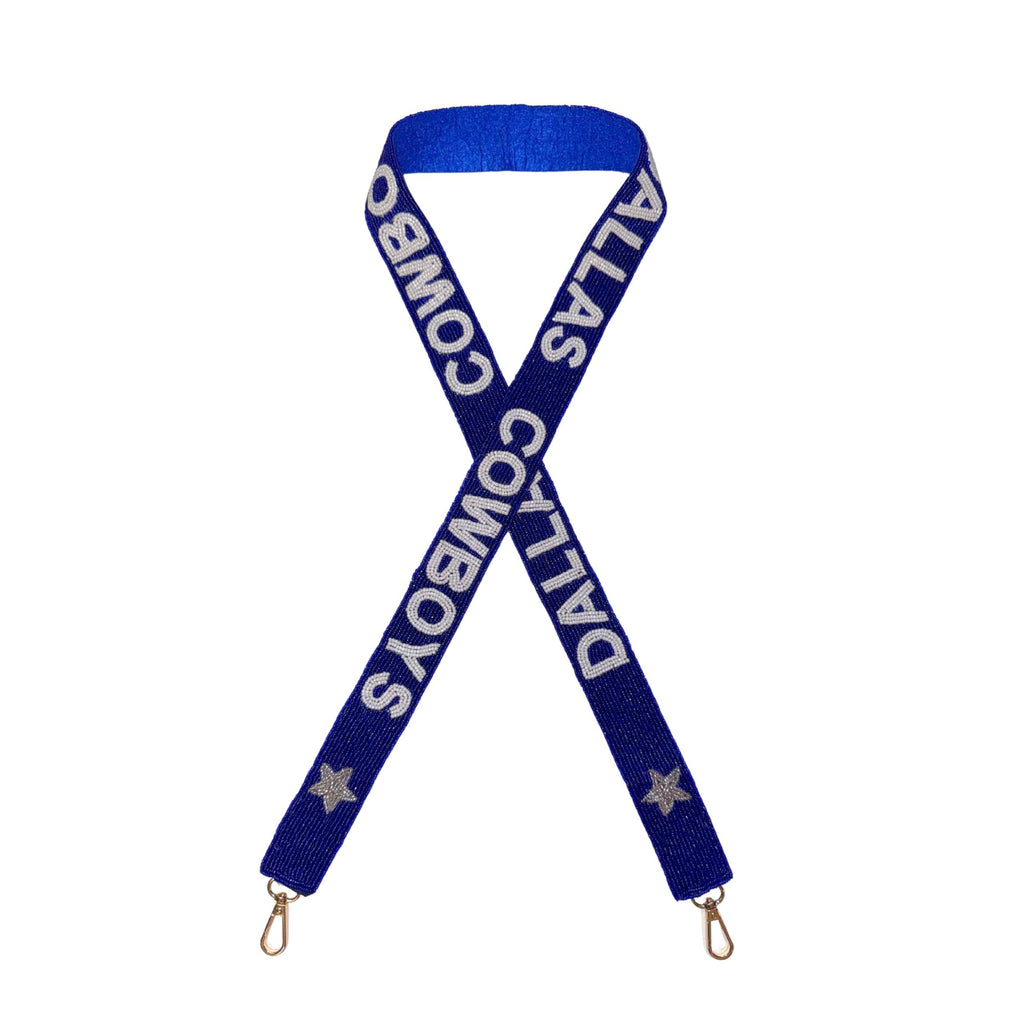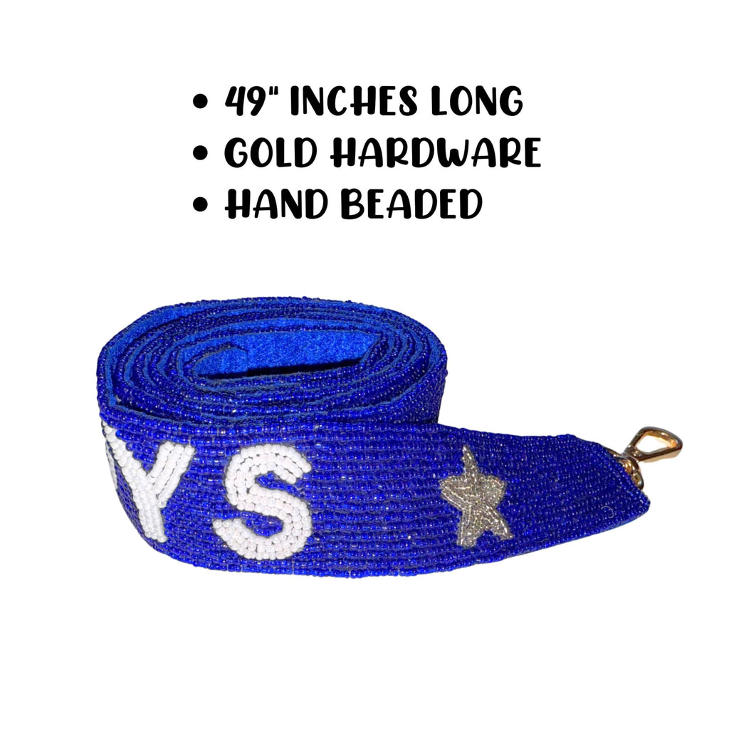 The Dallas Beaded Purse Strap (49 inches with gold hardware) is the perfect accessory to add a touch of sophistication and style to your bag collection. Featuring a vibrant blue beaded purse strap with white letters and silver star accents, this hand-beaded design captures the perfect balance of team spirit and elegance. The polished gold hardware adds a hint of luxury and warmth, creating a beautiful contrast with the cool tones of the blue beads and silver stars. Perfect for clear purses, crossbody bags, or gameday totes, this strap lets you show your Dallas pride in a chic and timeless way.