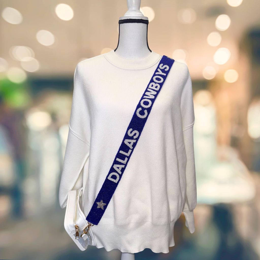 Crafted with seed bead construction, this durable strap ensures long-lasting use while maintaining its refined, handcrafted appearance. The adjustable 49-inch length offers flexibility to wear it as a crossbody or wide body purse strap, adapting effortlessly to your preferred style and comfort. Ideal for gameday accessories, the Dallas beaded strap is a must-have for anyone looking to enhance their sports bag collection or university-inspired gameday designs. The mix of blue beads, white letters, and silver stars brings a striking, modern, and spirited look to any outfit—perfect for showcasing your team colors with pride.