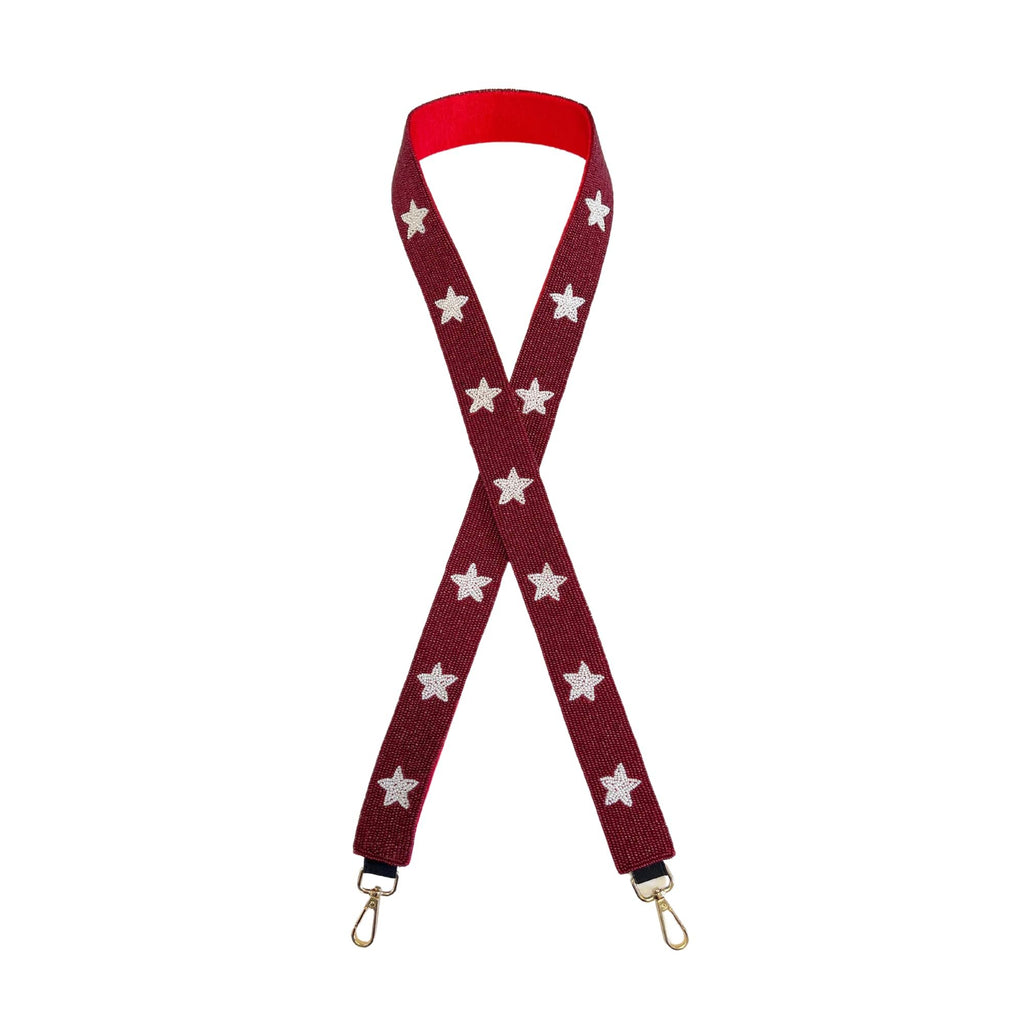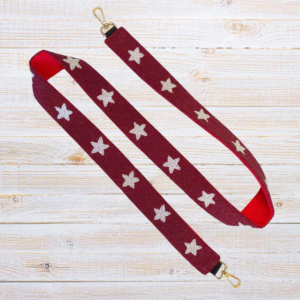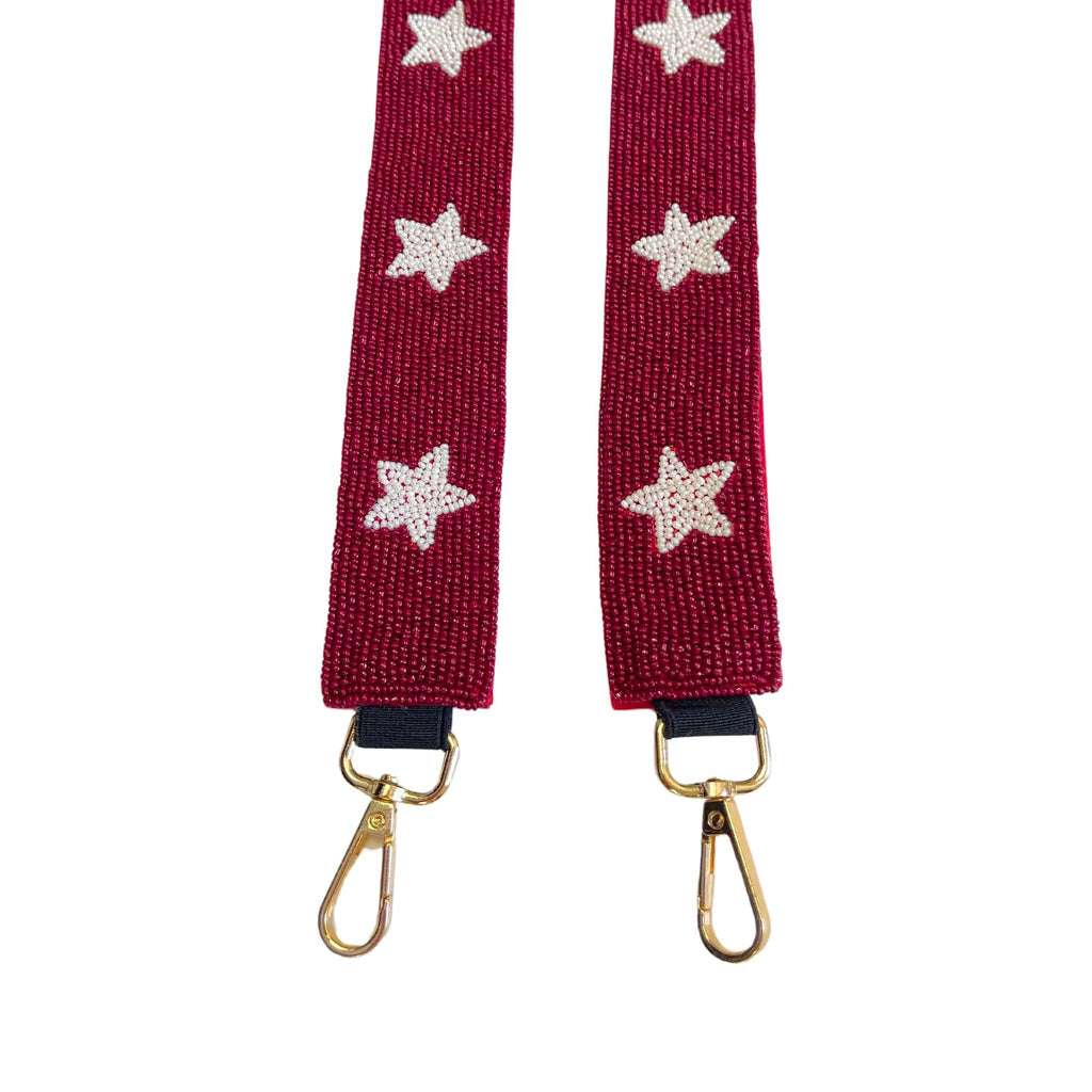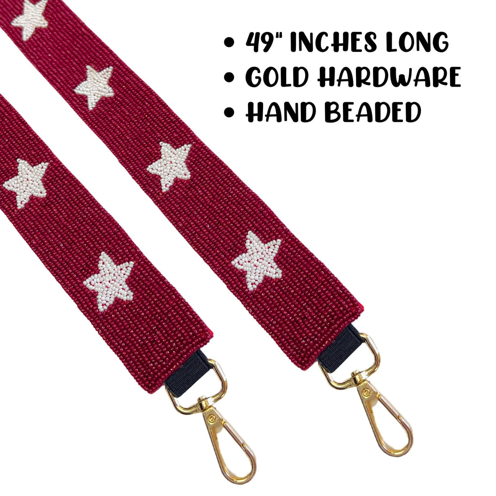 This star purse strap is also a fantastic accessory for school cheer beaded game day straps or for adding a festive touch to your crimson gameday merchandise collection. The bold red and white star beaded strap makes it a unique addition to your crimson handbag or compartment purse, and it's a great match with a gold buckle handbag or a red leather purse strap for added elegance. As a thoughtful accessory gift, this strap is perfect for any occasion, whether it's for a birthday, graduation, or simply for those who love to express their team pride with a stylish flair.