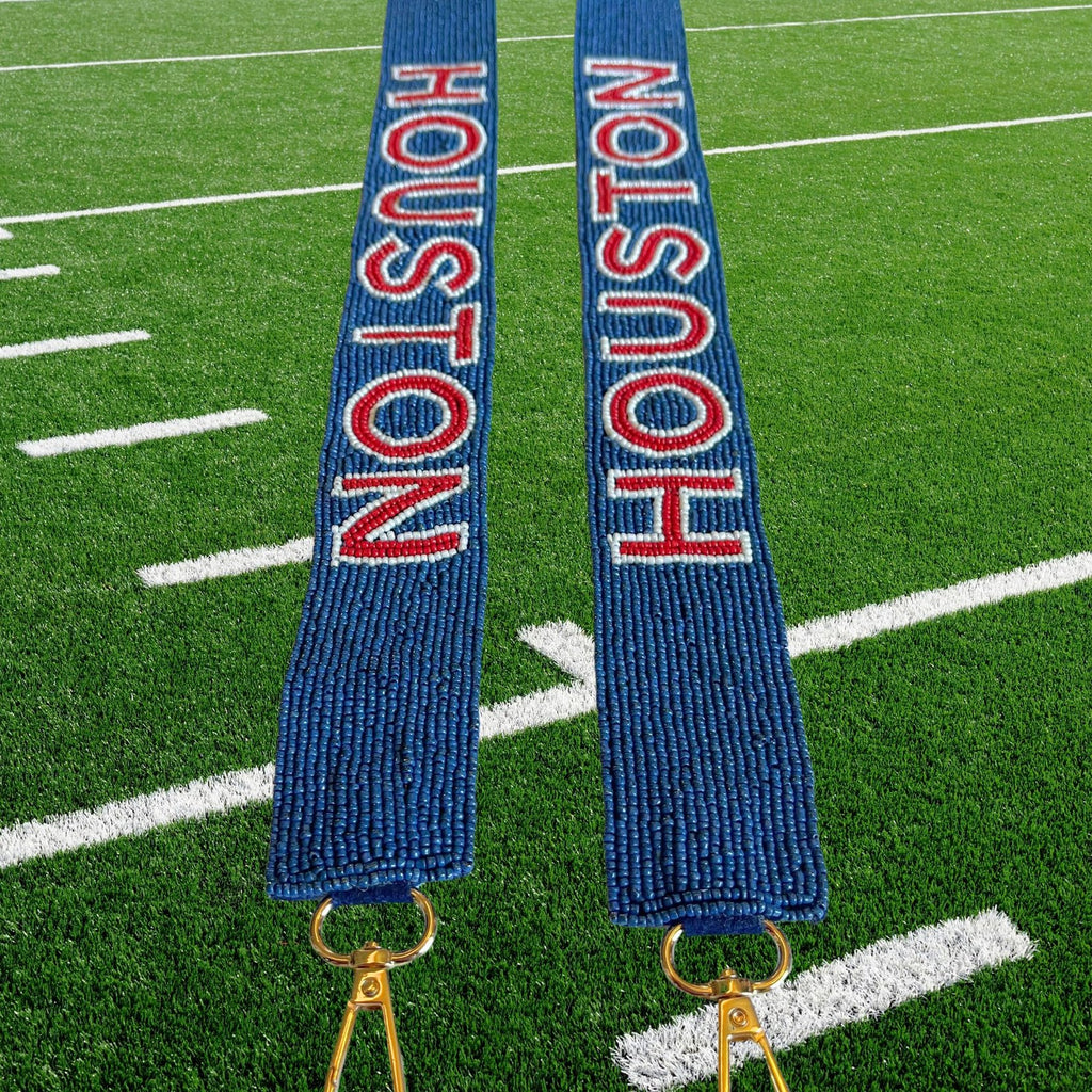 Bold Dark Blue and Red Beaded Design: Featuring a striking combination of dark blue and vibrant red beads, this hand-beaded strap lets you showcase your Houston team spirit with style while adding a pop of color to any bag.