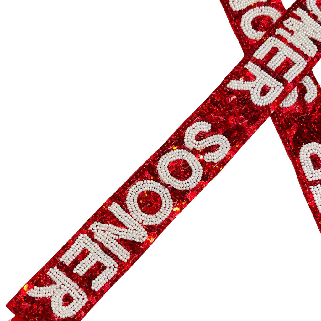 Experience the perfect blend of style and team spirit with our 49" Crimson and White Beaded Purse Strap, designed to celebrate Oklahoma. This unique strap is meticulously handcrafted, featuring white beads with bold crimson lettering that proudly showcases your love for Oklahoma football. The strap's design makes it a versatile accessory, ideal for any game-day outfit, whether you're heading to the stadium or enjoying a college football gathering.